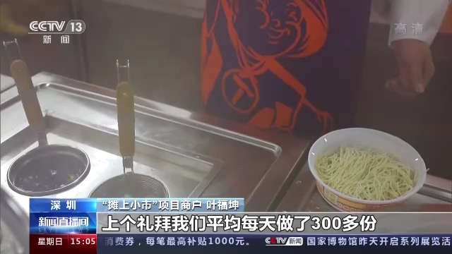“摊上小市”项目商户 叶福坤:房租不用我们出,没有压力,什么材料都是平台提供,我们负责出餐就行了,上个礼拜我们平均每天做了300多份,有时候我们两个人忙不过来,他们公司还会派人过来帮忙。