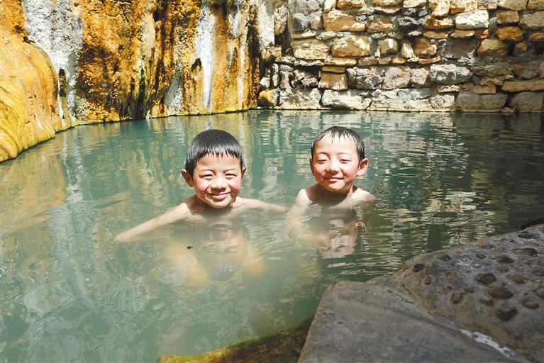 小朋友在拉萨市墨竹工卡县门巴乡德仲温泉里嬉戏。 记者 格桑伦珠 通讯员 洛克 摄