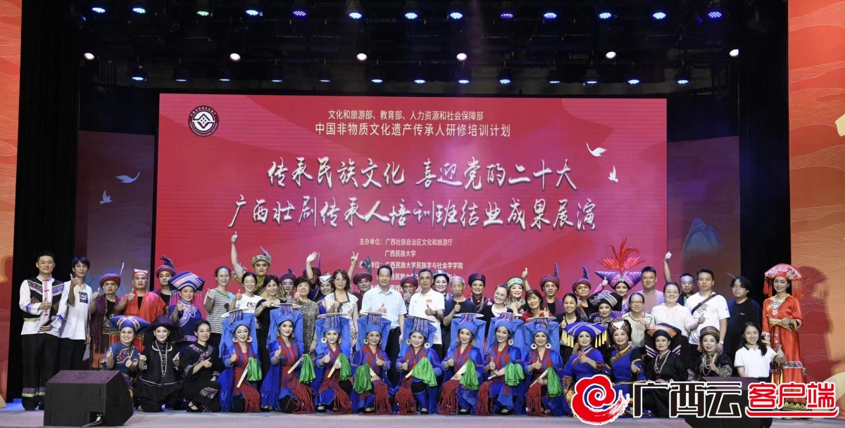 为展示壮剧培训班成果,近日,由自治区文化和旅游厅、广西民族大学主办,广西民族大学民族学与社会学学院、文化遗产研究中心承办的“传承民族文化 喜迎党的二十大——广西壮剧传承人培训班结业成果展演”在相思湖校区举行。