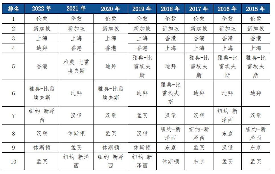 最新结果显示,2022年国际航运中心城市排名前十依次是新加坡、伦敦、上海、香港、迪拜、鹿特丹、汉堡、纽约-新泽西、雅典-比雷埃夫斯、宁波舟山。与往期相比,整体排名的变化幅度较小。一方面领先的国际航运中心城市的航运资源集聚与配置能力已逐步沉淀,进入相对稳定的阶段性格局;另一方面受疫情影响,大批港口码头的建设项目进展较慢。