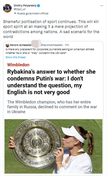 【环球网报道 记者 张江平】出生于莫斯科、夺得温网女单冠军的哈萨克斯坦球员莱巴金娜9日在记者会上被追问有关俄乌冲突一事持续引发关注。俄罗斯常驻联合国第一副代表波利扬斯基当地时间10日发推批评称,这是“将体育政治化的可耻行为”。