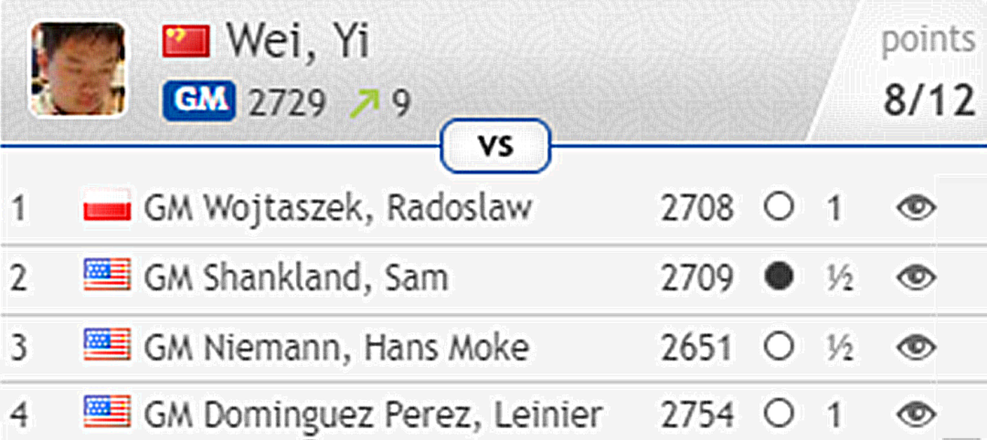 目前韦奕与美国棋手塞维扬、阿塞拜疆棋手马梅季亚洛夫和波兰棋手杜达同积8分,并列积分榜第二集团。