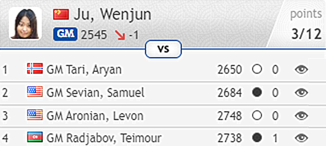 全场唯一女棋手,现任世界棋后居文君首日取得1胜3负,与荷兰棋手吉里和美国棋手的多明格斯并列积分榜第12-14位。居文君在前三轮相继告负后,第四轮执黑力克阿塞拜疆名将拉贾波夫。