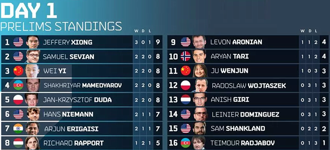 单循环预赛共进行15轮,持续四天。在预赛首日四轮比赛中,21岁的美国华裔棋手熊奕韬发挥出色,以3胜1负积9分,暂列积分榜榜首。前三轮熊奕韬相继战胜荷兰名将吉里、美国棋手尼曼和挪威棋手塔里,第四轮输给了美国棋手塞维扬。