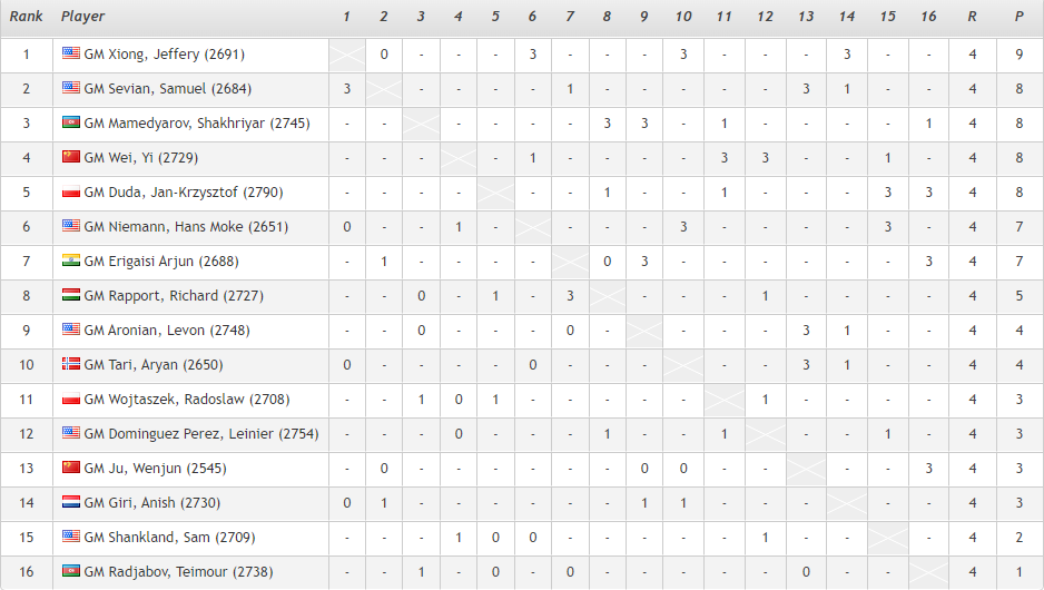16名参赛棋手如上所示。除两名中国棋手韦奕和居文君之外,还有杜达(波兰)、吉里(荷兰)、多明格斯(美国)、拉贾波夫(阿塞拜疆)、马梅季亚洛夫(阿塞拜疆)、阿罗尼扬(美国)、拉波尔特(匈牙利)、沃伊塔泽克(波兰)、塞维扬(美国)、塔里(挪威)、熊奕韬(美国)、埃里加伊斯(印度)、尚克兰(美国)和尼曼(美国)。