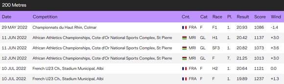 这位选手就是来自毛里求斯的毕比,他以19秒89(+1.3)的成绩夺得了本次比赛的冠军,并且大幅度提升了自己的200米个人最好成绩,此前他的200米最好成绩是今年5月底在Colmar Du Haut Rhin锦标赛中拿到的20秒93(-1.4)。而现在他在短短的2个月不到的时间里已经将这项个人最好成绩拉高到了19秒89较之以前有着1秒多的进步,可以说是非常罕见的进步幅度了。