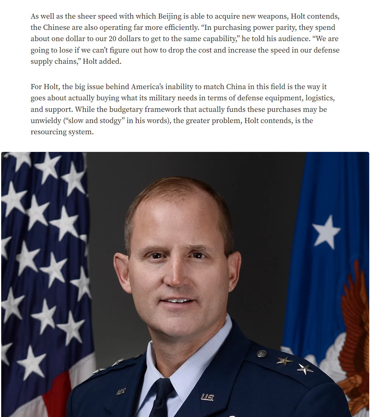 发表该言论的是美国负责采购的空军副助理部长,卡梅伦霍尔特少将,因为霍尔特负责采购新武器以及后勤部分外加整体运营等,所以他对美国的军事采购计划是了如指掌的。霍尔特指出我国能够以非常快的速度获得新武器,而且无论是研制还是采购,包括军队内部的运作效率都要比美国高得多。在采访当中他表示,我国一美元顶美国20美元,而且他们并不知道我国如何降低武器采购和研制的成本。