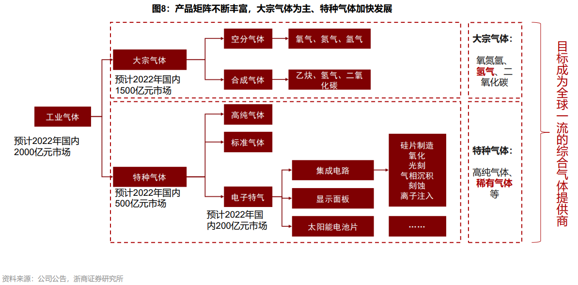 公司定位于综合气体解决方案供应商,产品矩阵将不断完善,电子特气、零售气体等高附加值业务将打造第二成长曲线。