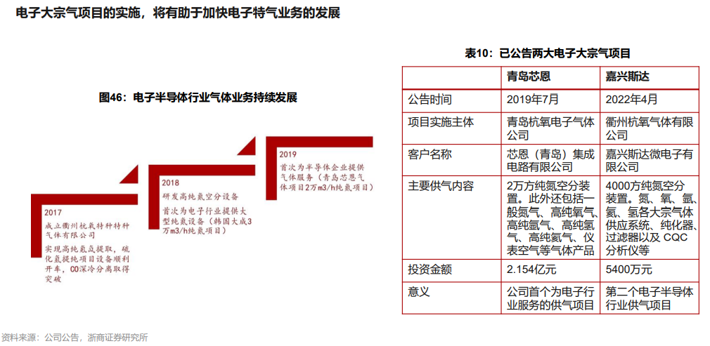 电子大宗气是电子气业务的基础,本土替代空间广阔,公司配套的青岛芯恩二期项目有望于2022年下半年投入运营,此外斯达半导电子气项目落地标志项目加速。