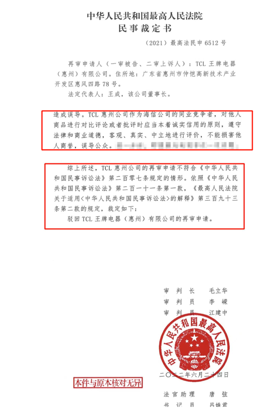 最终,最高院认定:TCL公司作为海信公司的同业竞争者,对他人商品进行对比评论或者批评时应当本着诚实信用的原则,遵守法律和商业道德,客观、真实、中立地进行评价,不能损害他人商誉,误导公众。作为同业竞争者,对真实的信息描述也应客观、全面。被诉行为的片面性和不准确性,容易导致消费者对相关商品产生错误认识,进而影响消费者的决定,并对海信公司的商业信誉和商品声誉产生负面影响,损害海信公司的利益。故二审法院认定TCL的被诉行为构成对海信公司的商业诋毁,并无不当。