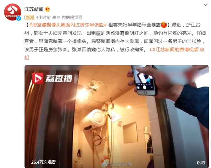 最近,浙江台州,郭女士夫妇无意间发现,出租屋的两盏浴霸照明灯之间,隐约有闪烁的亮光。仔细查看,里面竟暗藏一个摄像头。民警调取摄内存卡发现,画面闪过一名男子的半张脸,该男子正是房东张某。张某因偷窥他人隐私,被行政拘留。