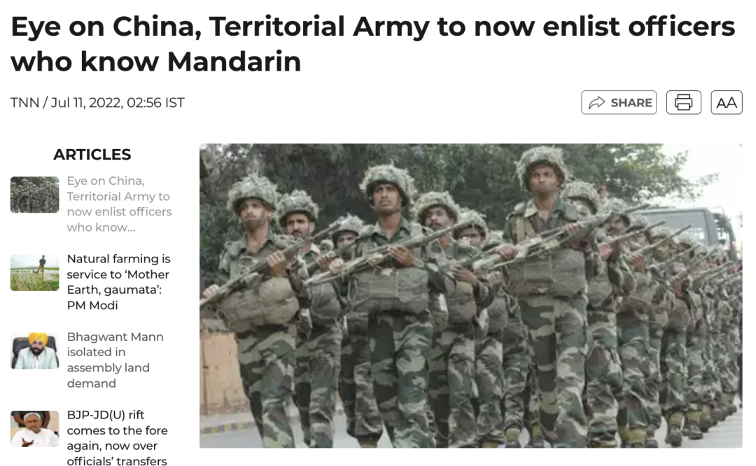 印媒报道指出,印度陆军招募的中文专家,也是在作战和战略层面提供分析所必需的。为此,印度陆军已与吉拉特邦的三所大学签署了谅解备忘录,为印度陆军培训普通话能力。位于中央邦伯杰默里的陆军训练学校和德里外国语学校的相关职位空缺也有所增加。此外,印度北部、东部和中央司令部的语言学校,也正在开设普通话教程。
