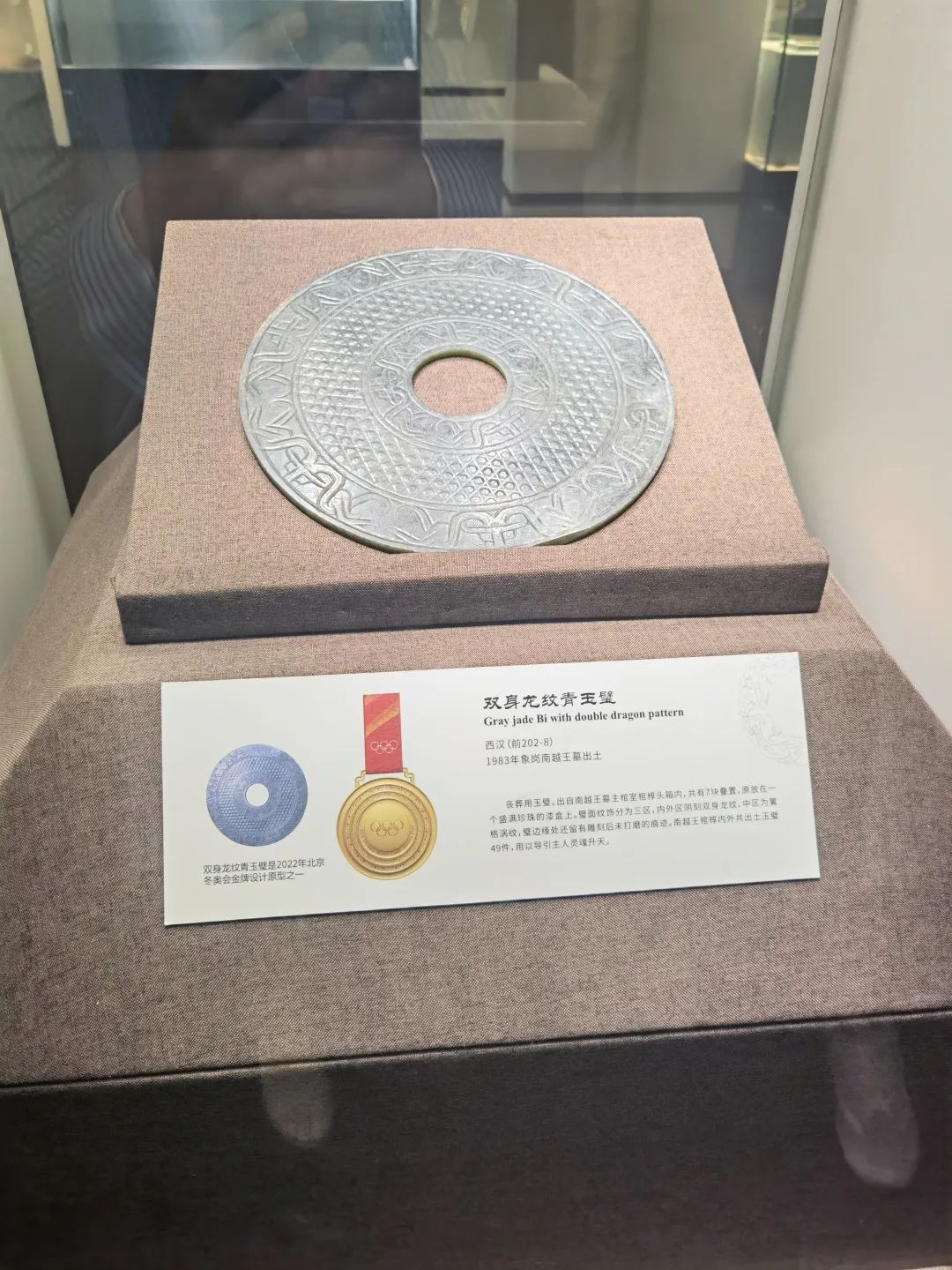 再仔细观察,璧面纹饰分为三区,内外区阴刻双身龙纹,中区为篱格涡纹。“许多人有所不知,这也是2022年北京冬奥会金牌设计灵感来源之一。”蔡亭亭说。