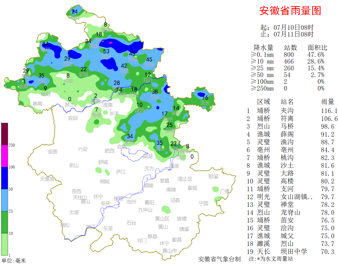 最大雨强:有230个站最大小时雨强超过20毫米,48个站超过40毫米,最强亳州82.1毫米(10日15-16时)。