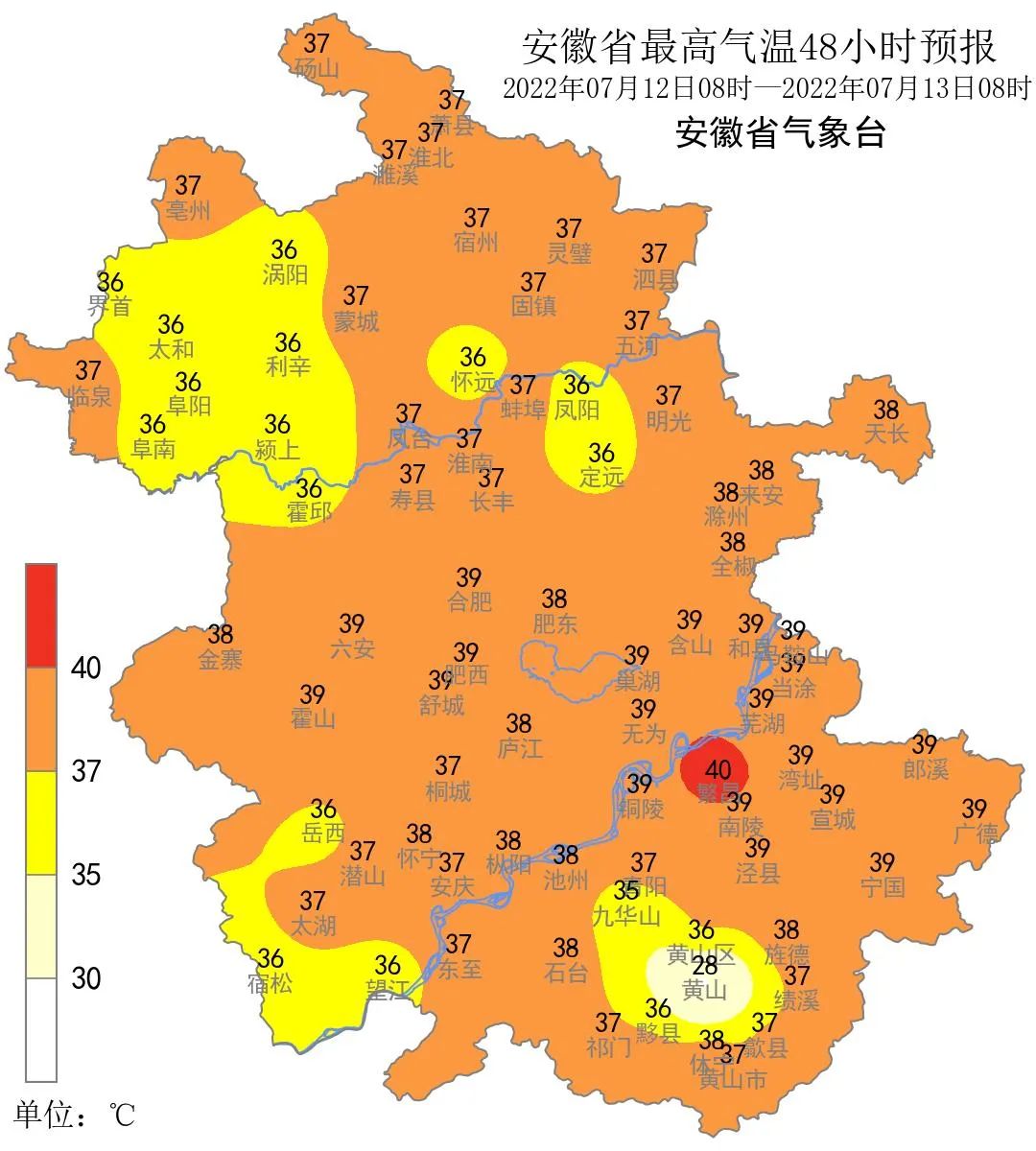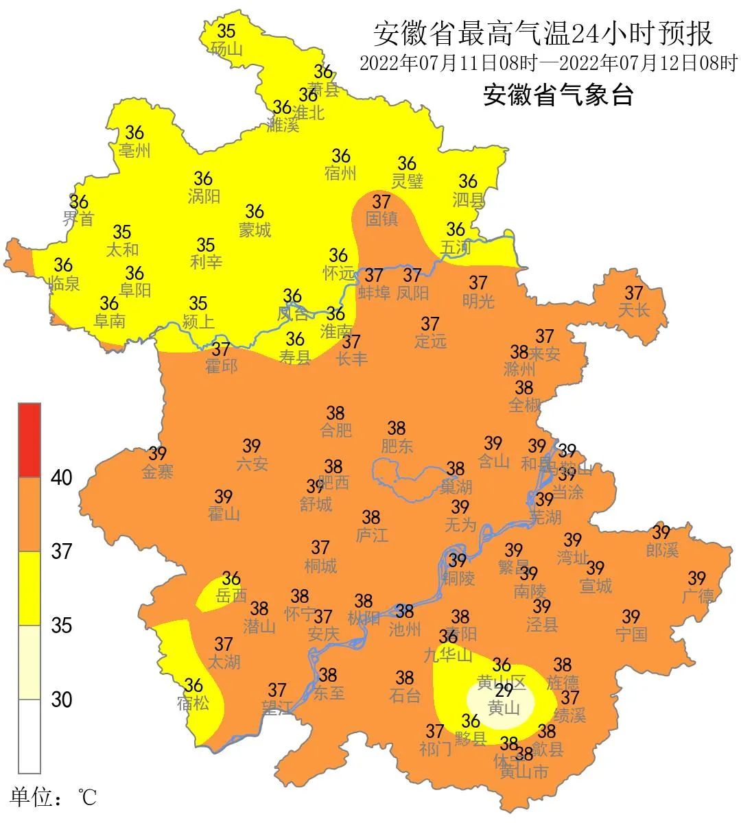 高温:11日至15日全省大部分地区、16日至17日淮河以南最高气温36~38℃,局地可达40℃左右;18日至20日全省最高气温31~34℃。