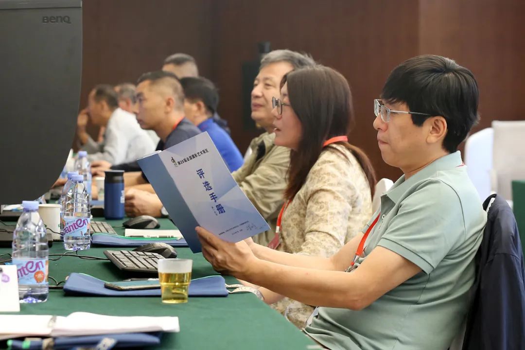 艺术类评委在仔细审读图片说明。
