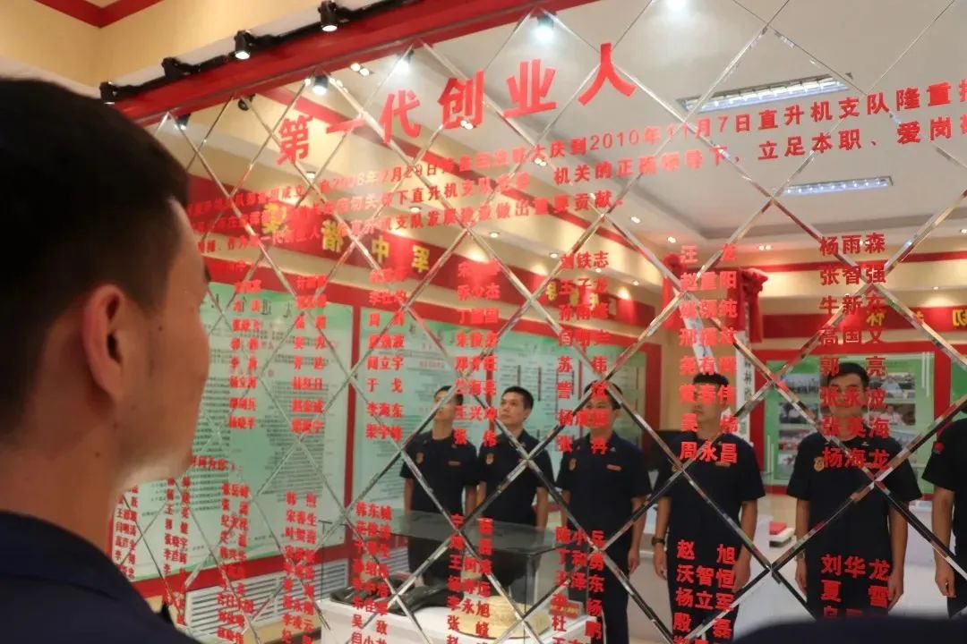队史的学习是所有实习学员的“第一堂必修课”,从“一人一马一杆枪”到“飞机+警察”,从“几十人的第一代创业人”到“南北两个航空救援支队”。通过讲述第一代创业人精神,让实习学员更充分的了解支队的历史和优良传统,摆正事业观和荣誉观,此外,支队充分利用现有资源,带领实习学员参观支队荣誉室、飞行大队荣誉室和机务大队荣誉室。荣誉室墙壁上挂满的锦旗奖章,让实习学员从“心”认识了支队。