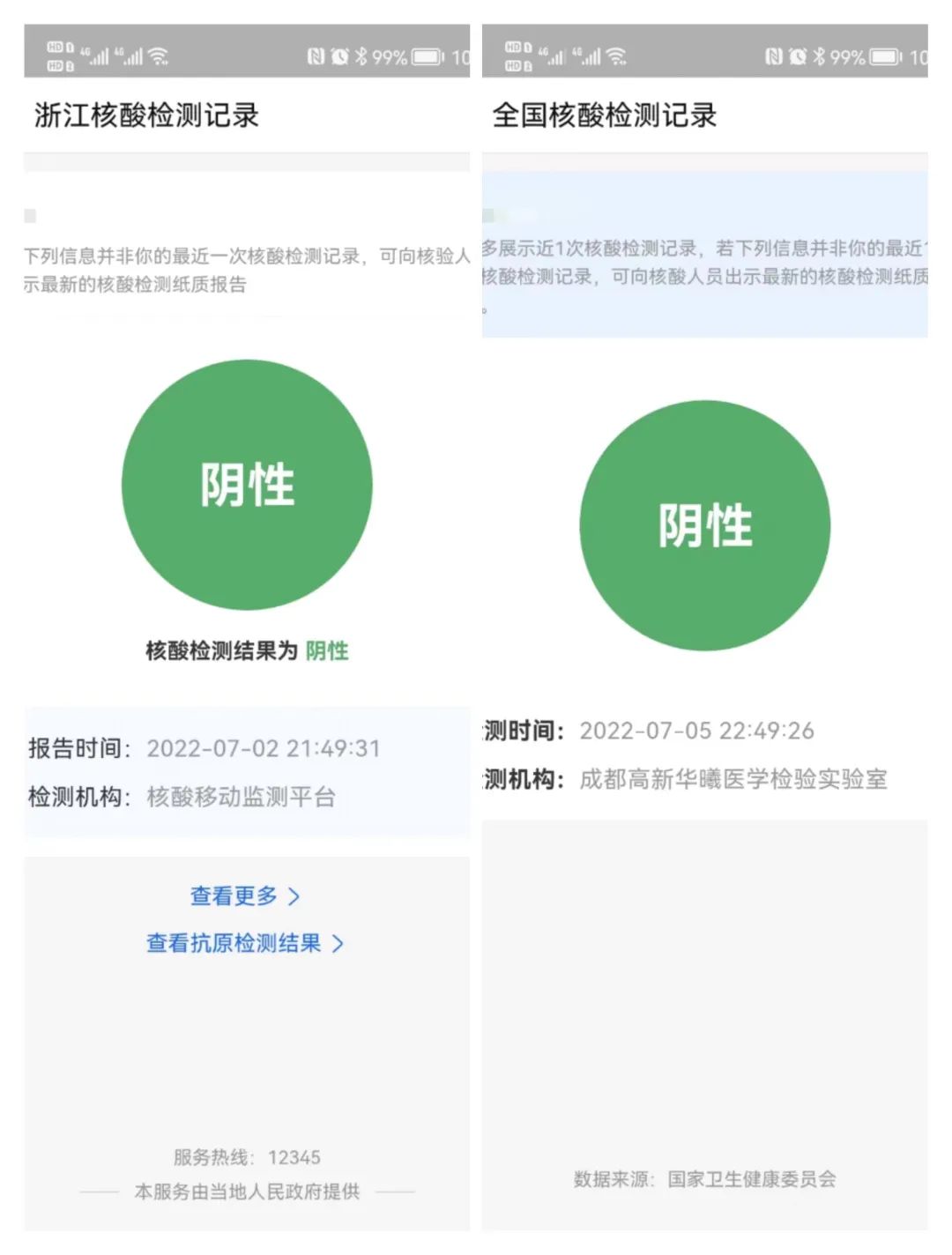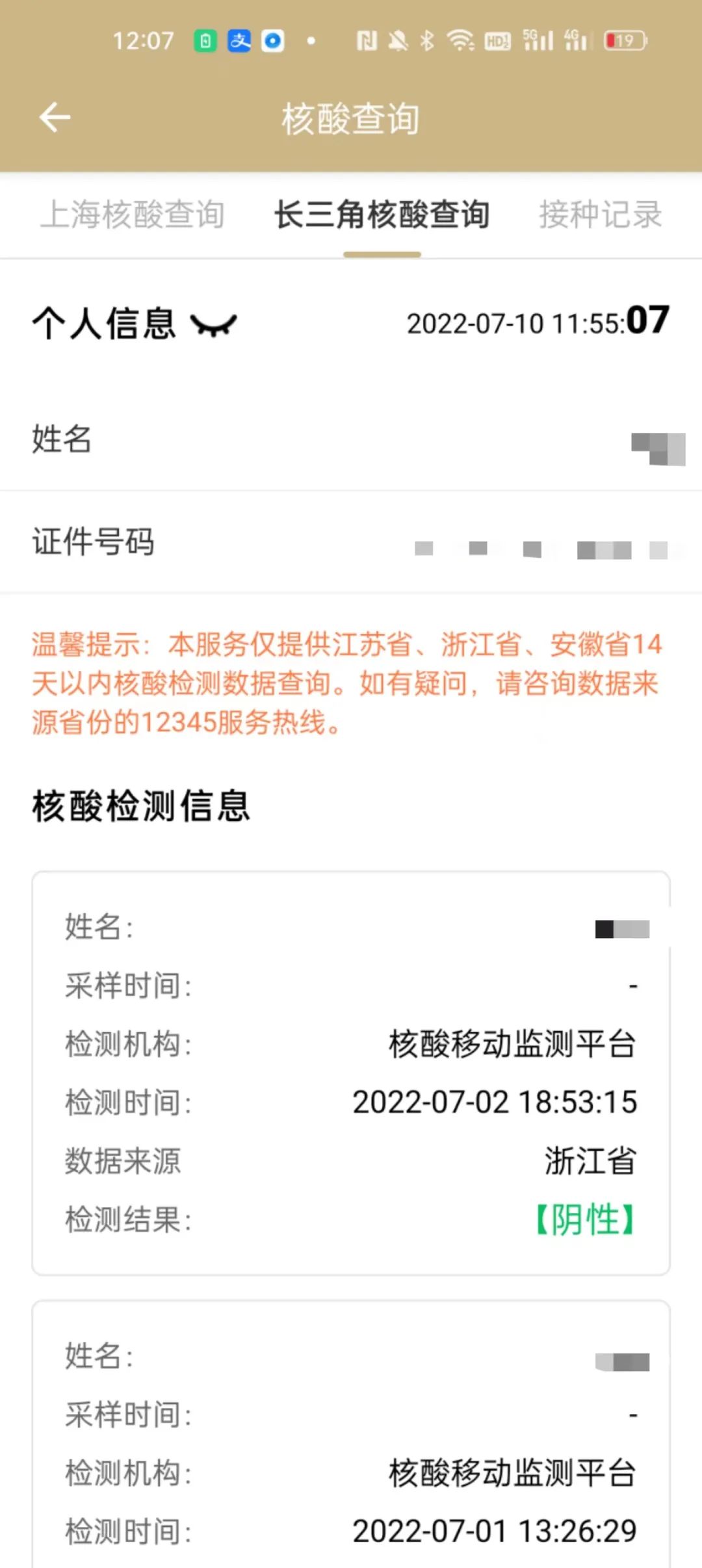 陈丘7月1日和2日,在杭州做的核酸检测结果,在这里都显示了出来。随申办的温馨提示也显示:“本服务仅提供江苏省、浙江省、安徽省14天内核酸检测数据查询。如有疑问,请咨询数据来源省份的12345服务热线。”