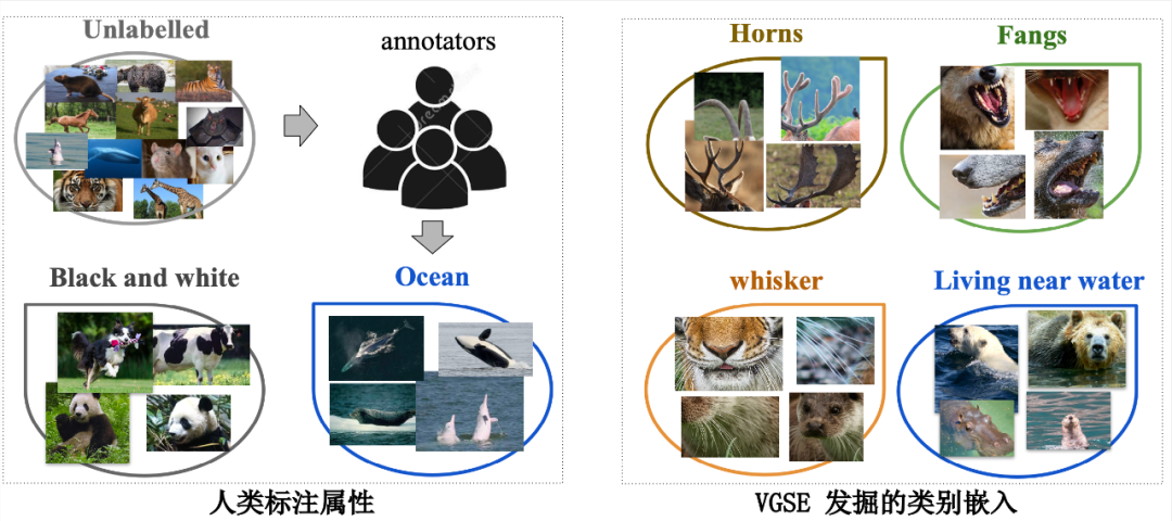 为了充分挖掘不同类别之间共享的视觉特征,VGSE 模型将大量局部图像切片按其视觉相似度聚类形成属性簇,从图像底层特征中归纳不同类别实例所共享的视觉特征。此外 VGSE 模型提出类别关系模块,在少量外部知识源的辅助下学习类别关系,能够将知识从源类别转移到目标类别,为没有训练图像的目标类别预测其类别嵌入。相较于其他基于语料自动挖掘而获得的属性,VGSE 模型在 CUB、SUN、AWA2 等零样本分类数据集上取得非常有竞争力的结果。如下图所示,本文能够发掘与人工标注属性互补的视觉特征,提高类别嵌入在视觉空间的完备性,对零样本学习中类别之间的知识转移有重要促进作用。本论文已被 CVPR 2022 录用。