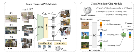 类别嵌入发掘模型 VGSE 的算法流程如下所示,该模型主要由两个模块组成:(1)切片聚类模块(Patch Clustering, PC)以训练数据集为输入,将图像切片聚类成不同的簇。(2)类别关系模块(Class Relation, CR)用于预测不可见类的语义嵌入。