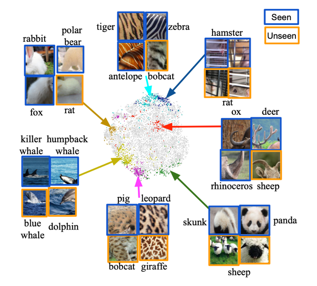 下图展示了在 AWA2 数据集中学习得到的属性簇。我们将 10,000 个图像切片的嵌入利用 t-SNE 映射到二维空间。本文采样了几个属性簇 (用相同颜色的点) 并在图中标记了来自该属性簇的图像切片。