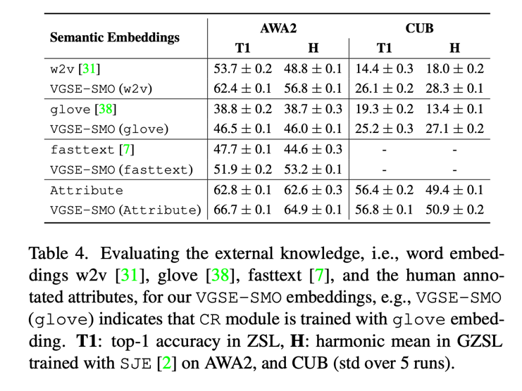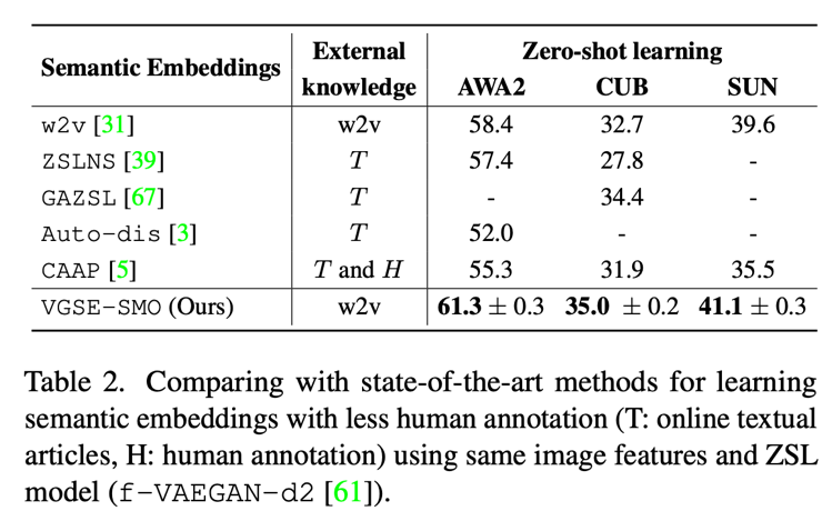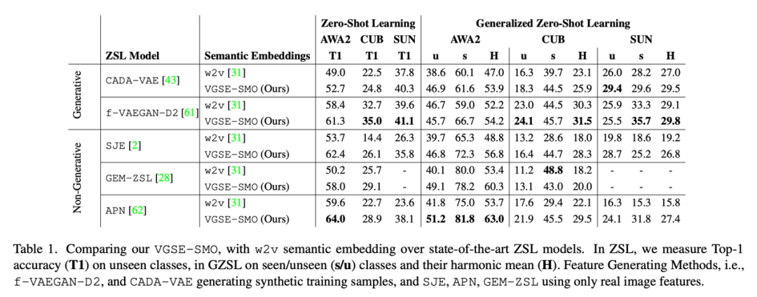 Table 1 展示了本文提出的类别嵌入 VGSE-SMO 与类别的 w2v 向量在三个数据集上的表现。为测试两种类别嵌入的能力,我们 f-VAEGAN-D2[5]等五种零样本分类模型上进行实验,结果表明本文提出的类别嵌入能够大幅度超越 w2v 向量的性能。