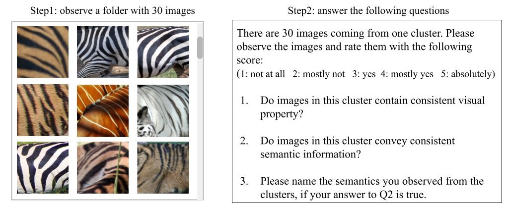本文进行用户调查探究所挖掘的类别嵌入的语义一致性和视觉一致性。随机挑选 50 个属性簇,并展示聚类中心的 30 张图片。用户首先被要求观察属性簇的示例图片。然后回答如下问题衡量属性簇的效果。