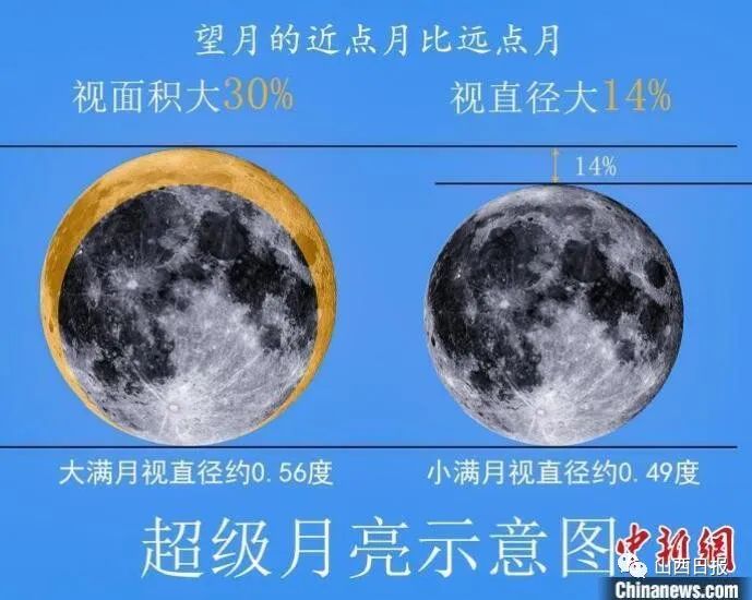 观察表明,同样是满月,满月在“近地点”比“远地点”,其视直径大14%,视面积大30%。