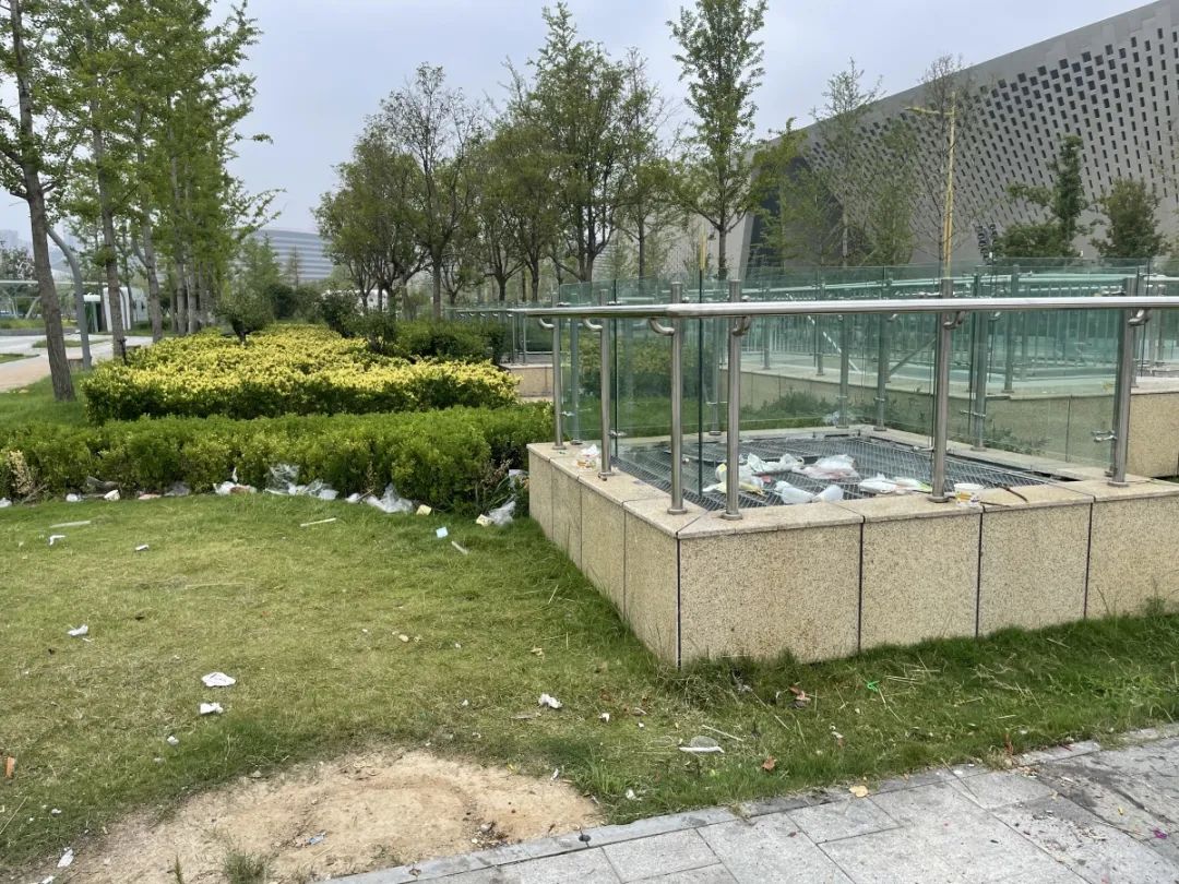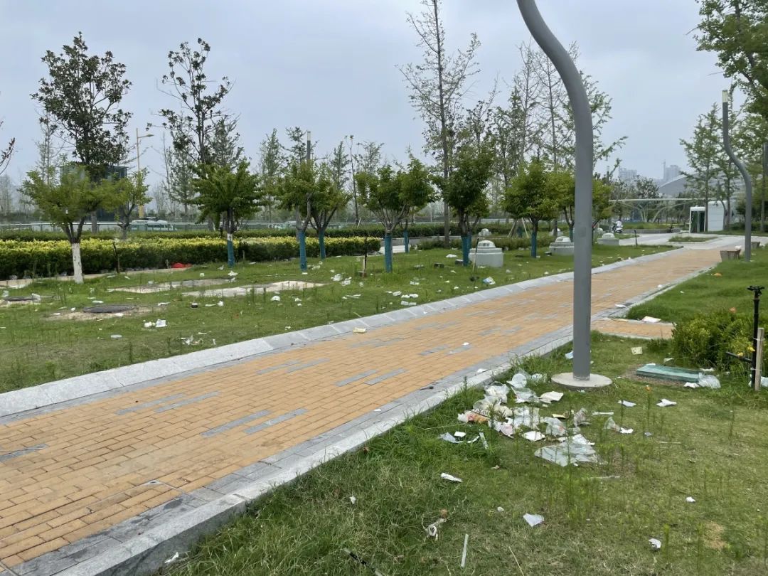 11日上午,记者在文澜街附近看到,路面大片油污清晰可见,走在路上甚至有些黏脚,一旁的草坪上数不清的纸碗、竹签、塑料袋等垃圾,一些商贩将车停在路边,讨论着今晚还能否摆摊,现场有工作人员正对滞留的商贩进行劝离。