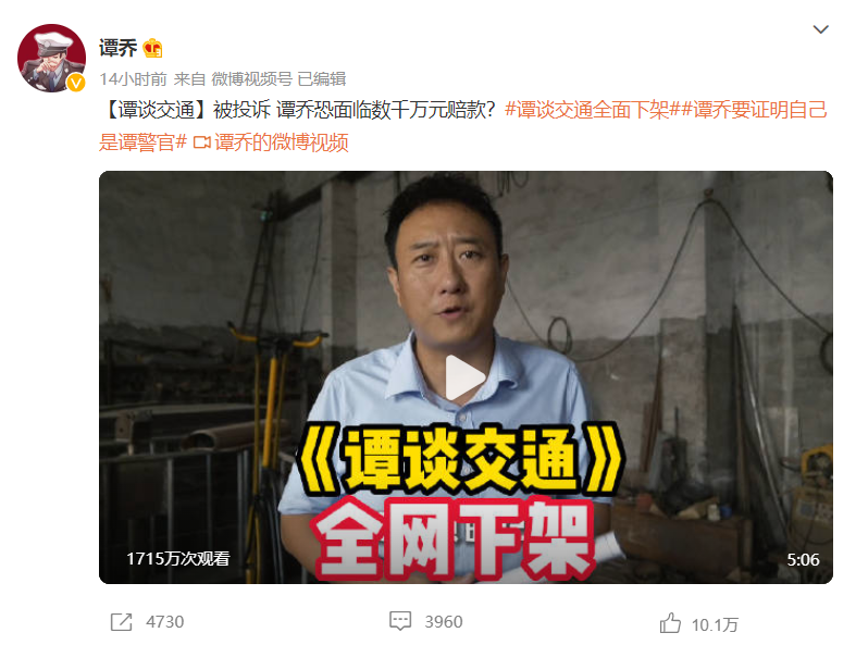 《谭谈交通》栏目主持人谭乔7月10日发布微博称,该栏目视频被下线并可能面临千万赔偿,引发关注。