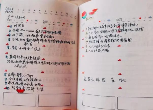那时候我特别想在大学中继续服务同学,就每天都会在手账本上为大家记录今天学院、学校和一些学生组织招新群里发的有用的消息,建了群相册供大家查看。每晚的九点左右我就会开始整理,这个过程不止帮助了大家,也让我对人大有了更全面的了解,认识了很多真诚友善的朋友和师兄师姐。