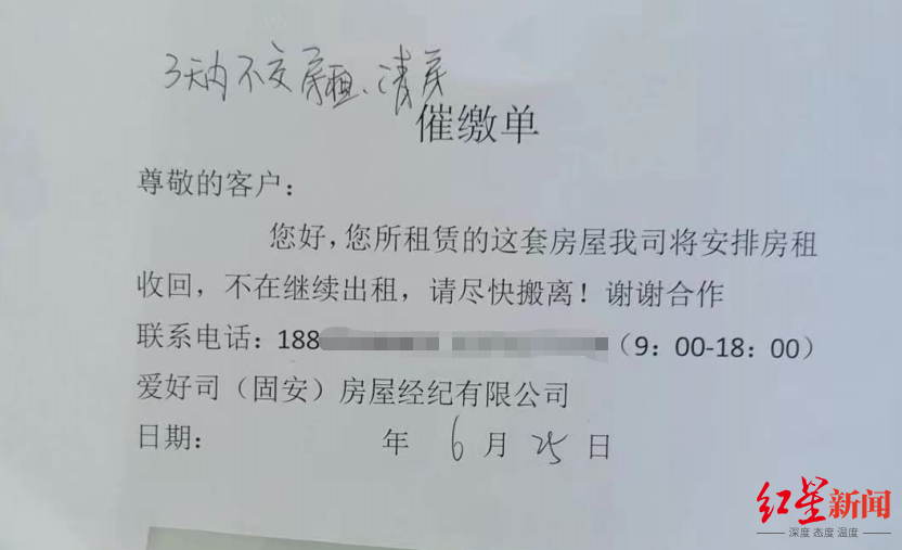 日前,红星新闻记者接到爆料,河北固安县的刘先生反映其一年前租来的房子,近日忽然遭到中介公司上门清退。中介公司告诉刘先生,其从二房东处租到的房屋,已经欠租。一位与刘先生有同样遭遇的租客告诉记者,向其出租房屋的女子张某实际是从中介和业主处租到房子再转租。张某向租客收取一至两年房租后,只向持有房源的中介公司和业主,交纳了短期房租。