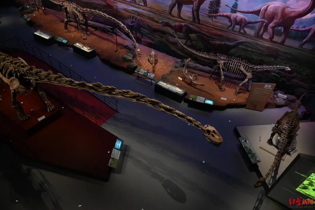 位于二楼的合川马门溪龙,最大的特点就是“大”。它是中国目前发现的最大的蜥脚类恐龙,因“模式种”发现于中国四川宜宾马门溪而得名。此属动物全长22米,体躯高将近4米。它的颈特别长,相当于体长的一半,不仅构成颈的每一颈椎长,且颈椎数多达19个,是蜥脚类中最多的一种。