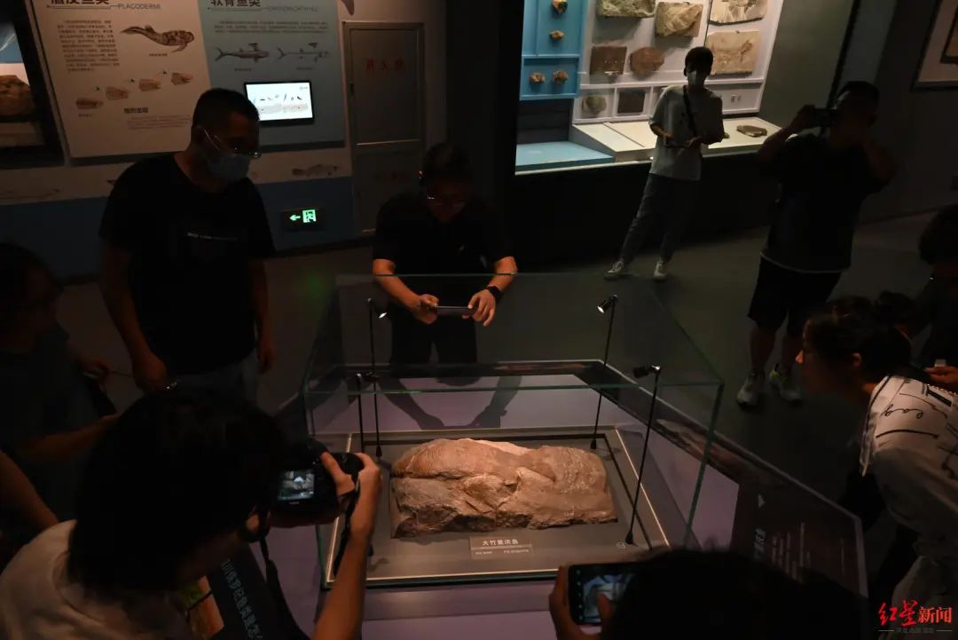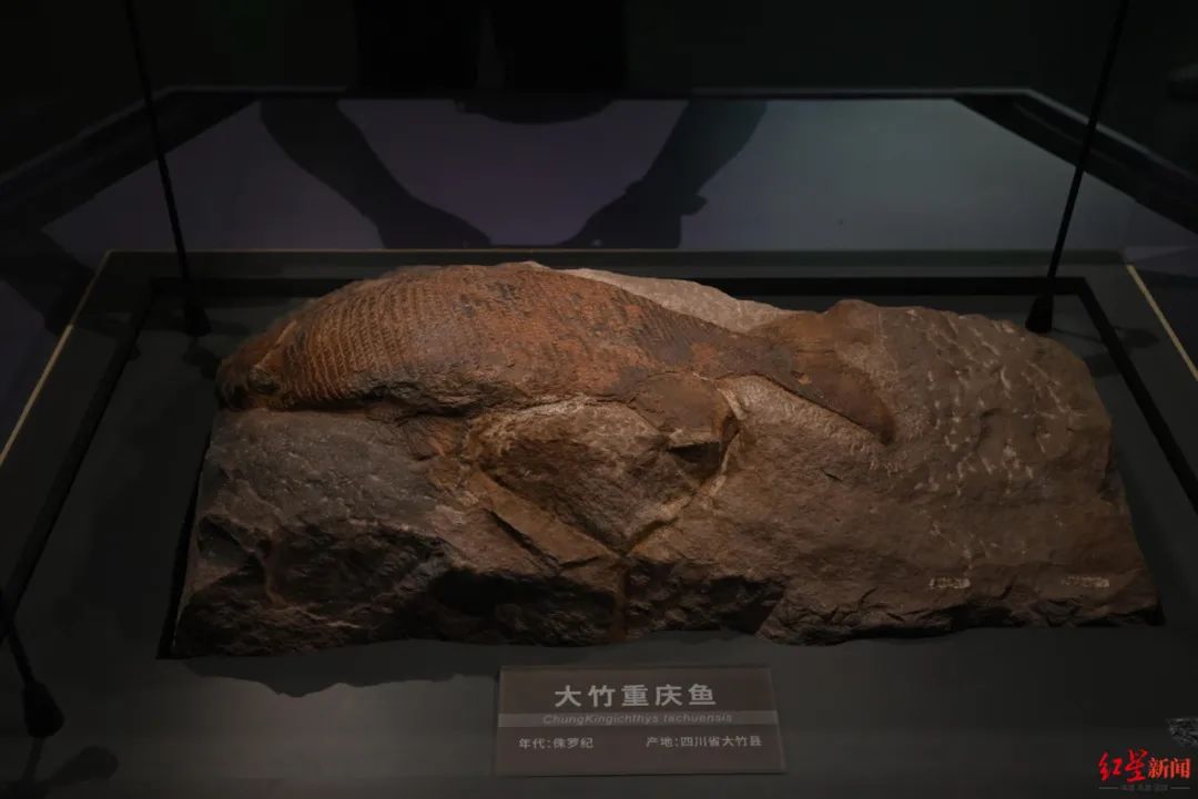 三大“镇馆之宝”的最后一件,是位于三楼、来自1.5亿年前的大竹重庆鱼。大竹重庆鱼属硬骨鱼纲、古鳕目,个体大,长纺缍形,背鳍居背中央,尾鳍为半歪尾型分叉深而大,鳞片厚呈菱形,生活于河流或湖泊之中。此标本保存非常完整,地质时代为晚侏罗世,距今1.5亿年前;产地为四川省大竹县;采集时间为1958年,具有极高的科学研究价值和收藏价值。