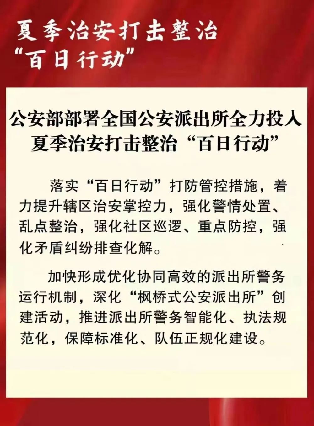 公安部日前下发通知,部署全国公安派出所充分发挥基层综合性战斗实体的职能作用,全力投入夏季治安打击整治“百日行动”,坚决维护社会治安大局持续安全稳定。