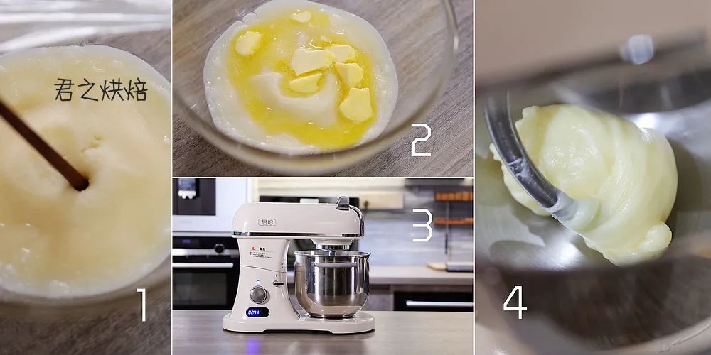 接着就可以开始揉了。要充分揉透,把黄油完全揉入面团里。可以用手在干净的台面上揉,也可以借助厨师机。我用的是君焙L1厨师机(图3),6档揉12分钟。