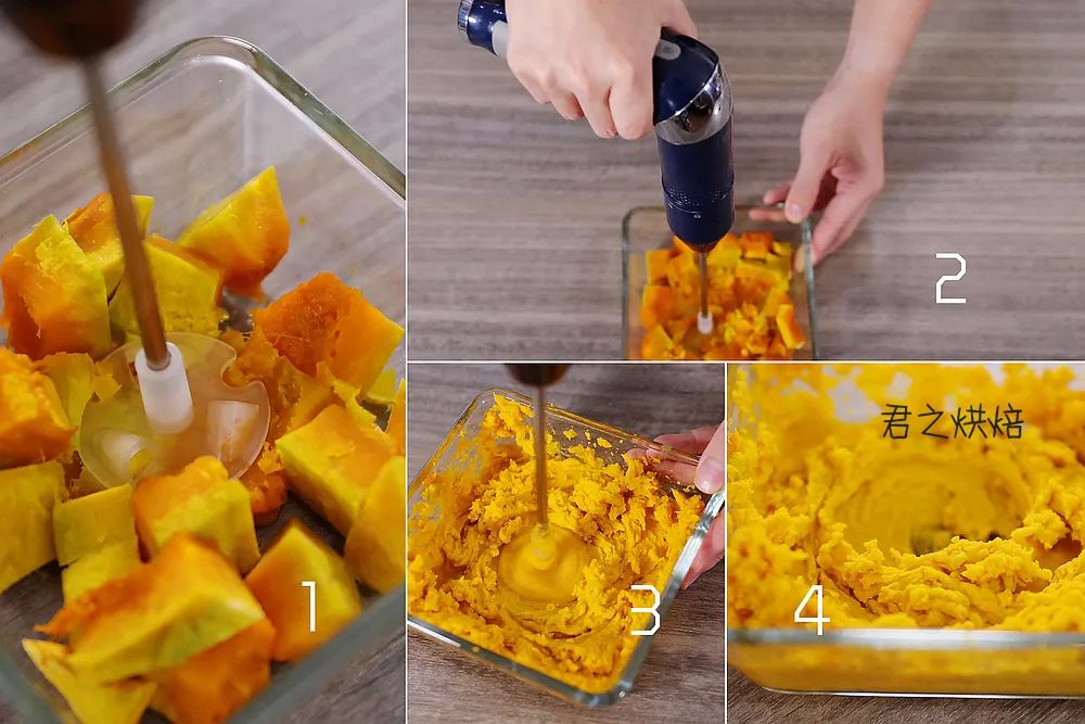 南瓜泥比较干,我用的君焙料理棒来搅拌,动力更强劲。