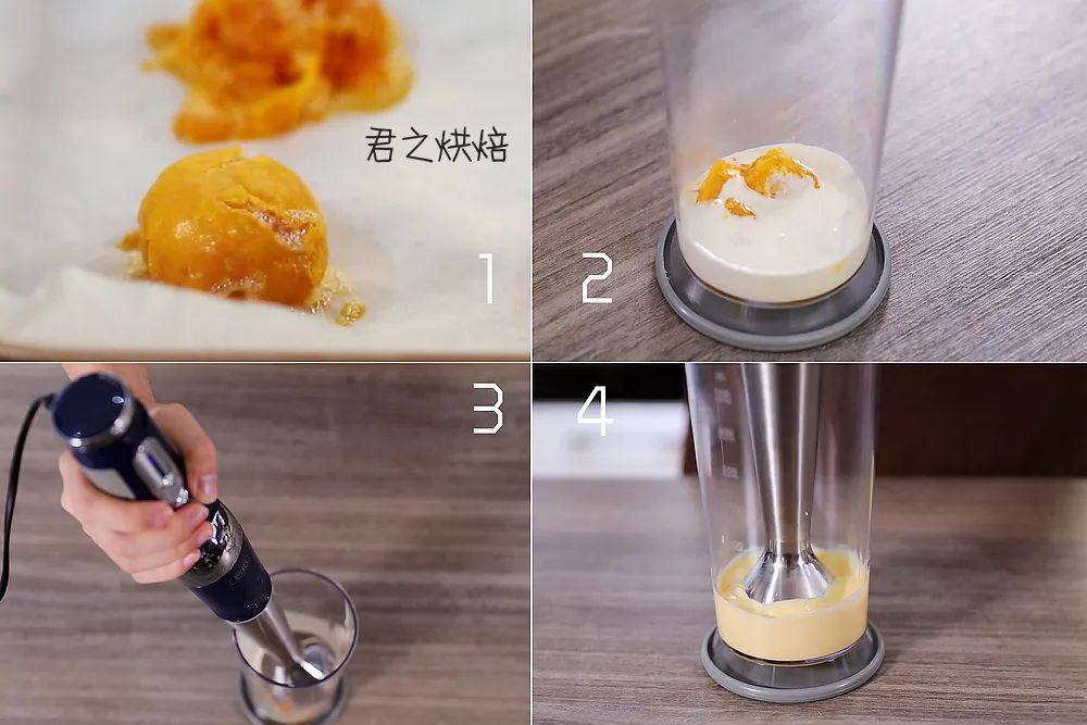 我们要将咸蛋黄彻底搅打至细腻。按理说破壁机也可以做到,但这个量有点少,破壁机打的话会大部分粘到杯壁上,不太好打起来。料理棒是最好的选择。我用的依旧是君焙D1料理棒。