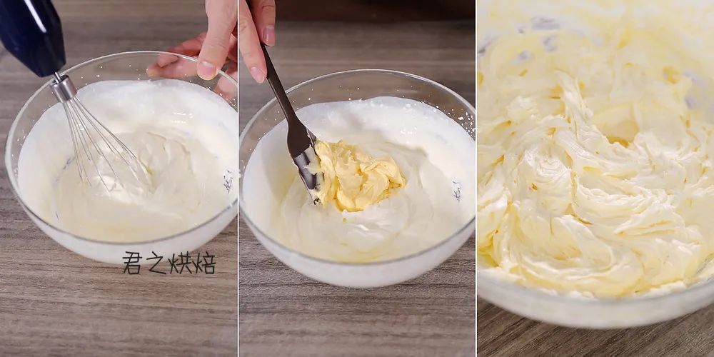 继续用电动打蛋器打发,打到蓬松硬挺的状态。打发好的咸蛋黄奶油尽快使用,并使它保持低温状态(温度太高会化)。