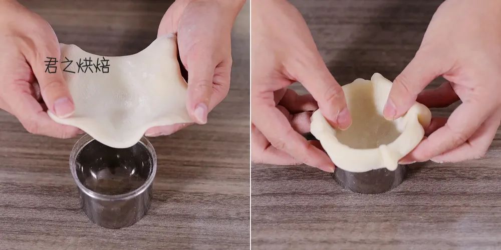 接着,把雪媚娘皮放入之前准备的蛋黄酥盖子里(或者小碗之类的工具里),就可以准备往里面挤奶油了。