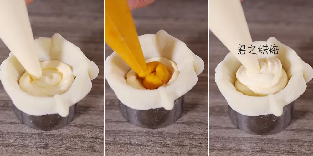 先挤一半咸蛋黄奶油(约20克),然后挤入12克左右的南瓜馅。接着再挤一半咸蛋黄奶油(约20克)。