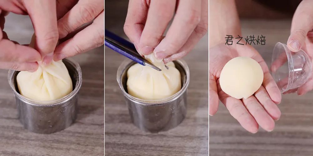 包好的雪媚娘,收口朝下从蛋黄酥盖子里扣出来,一个圆滚滚胖嘟嘟的雪媚娘就做好了。