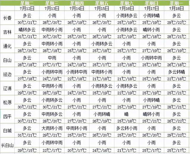 今天夜间,延边地区最低气温为18℃左右,其他地区19-23℃。明天白天,全省大部分地区最高气温为27-31℃。