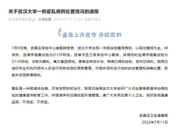 武昌区卫生健康局发布消息,确认武汉大学出现一例霍乱病例,具体情况是怎样的?