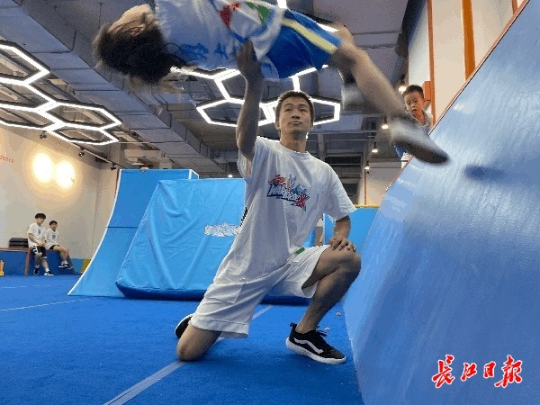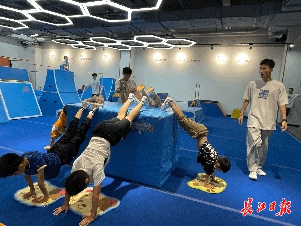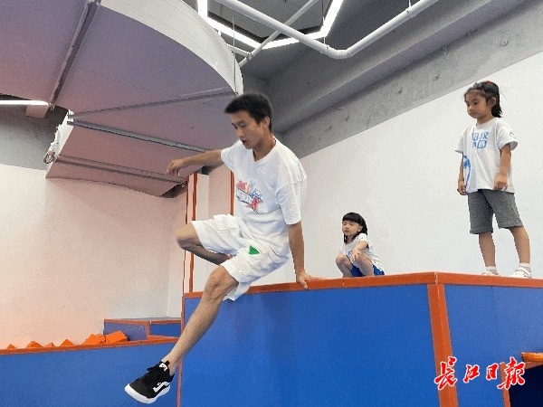 长江日报大武汉客户端7月11日讯(记者尹勤兵)200多平方米的室内空间,遍布各种高台和模拟障碍,一群平均年龄不到10岁的小朋友在教练带领下攀高、跨越、上蹿下跳……时而鱼跃、猫爬,犹如猿猴一样身手敏捷,不时做出超越年龄段的危险动作,让人一叹惊险。