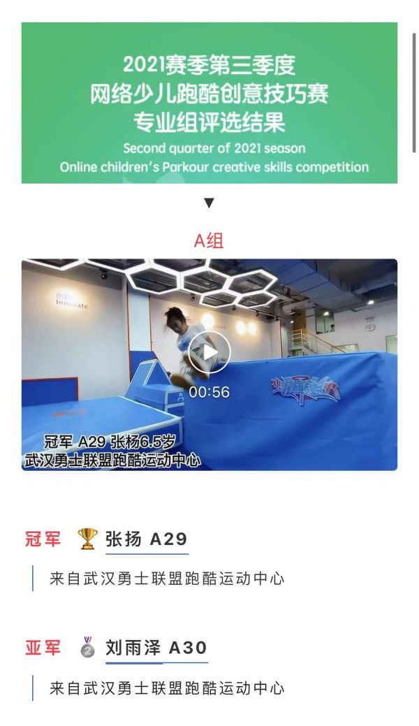 2021年10月,年近6岁的张扬参加北京网络体育发展促进会举办的2021赛季网络少儿跑酷创意技巧赛(第三季度),在同组参赛的30多名6至7岁同龄段孩子中,技压群雄,获得“全国冠军”。