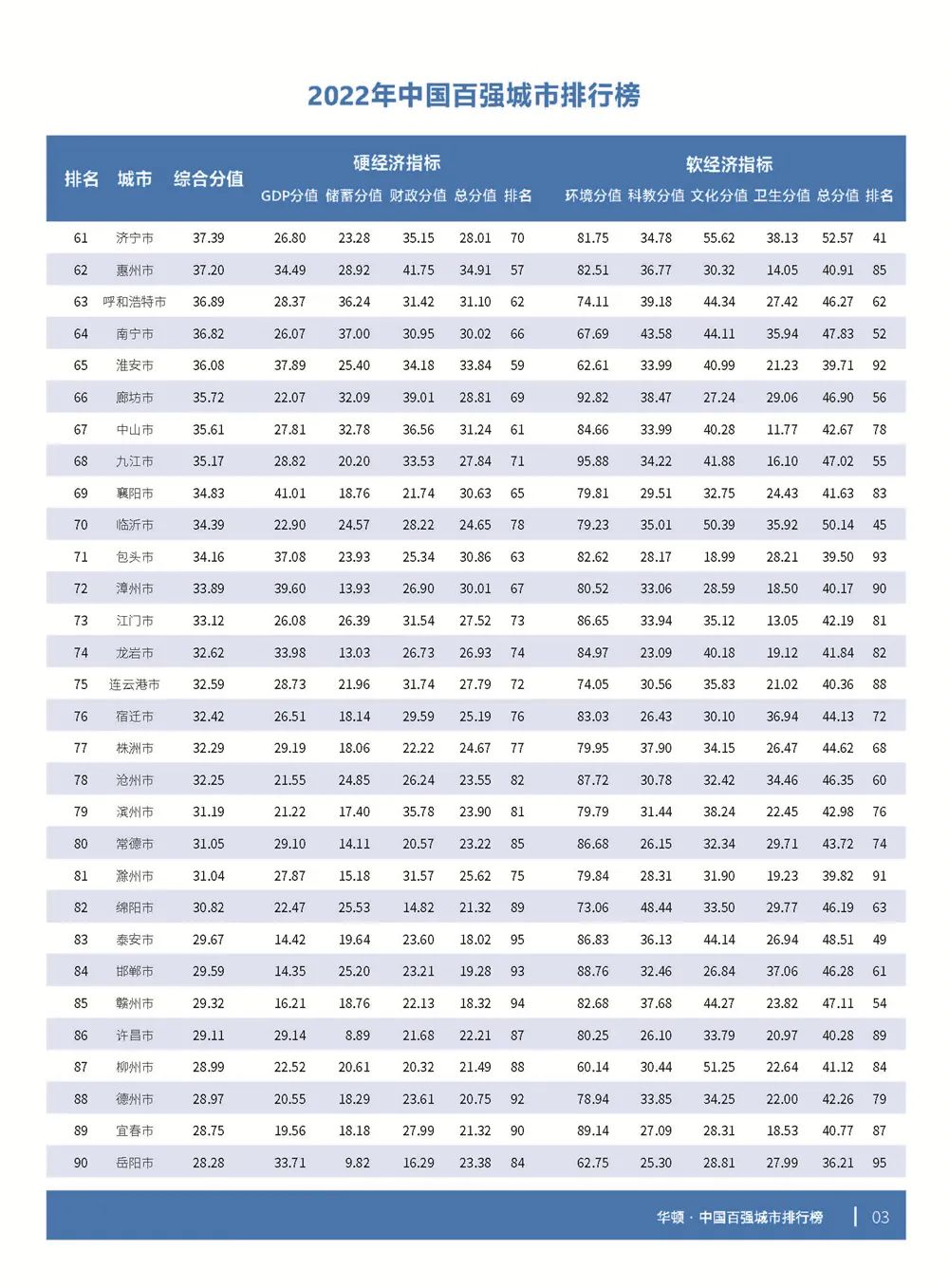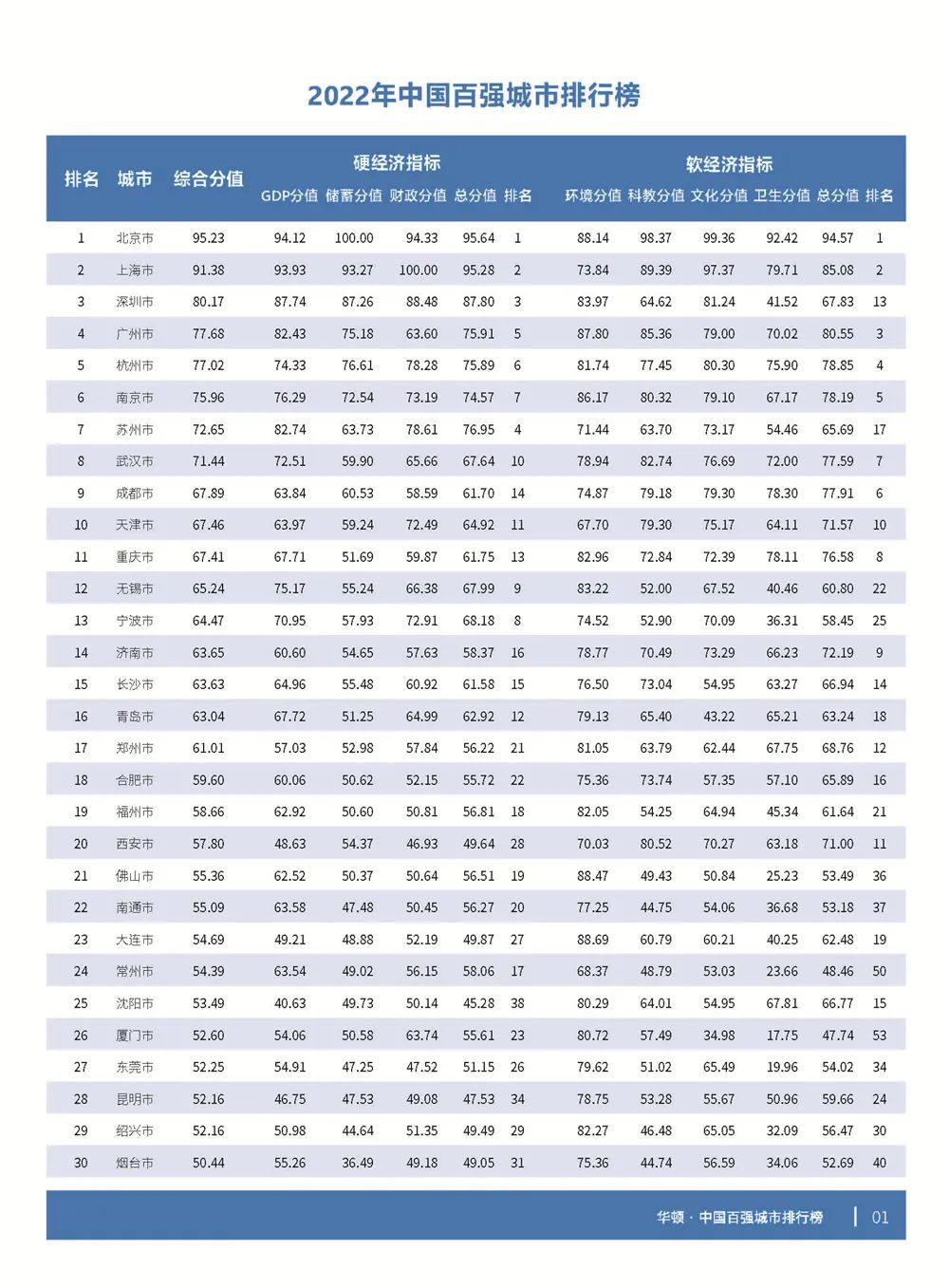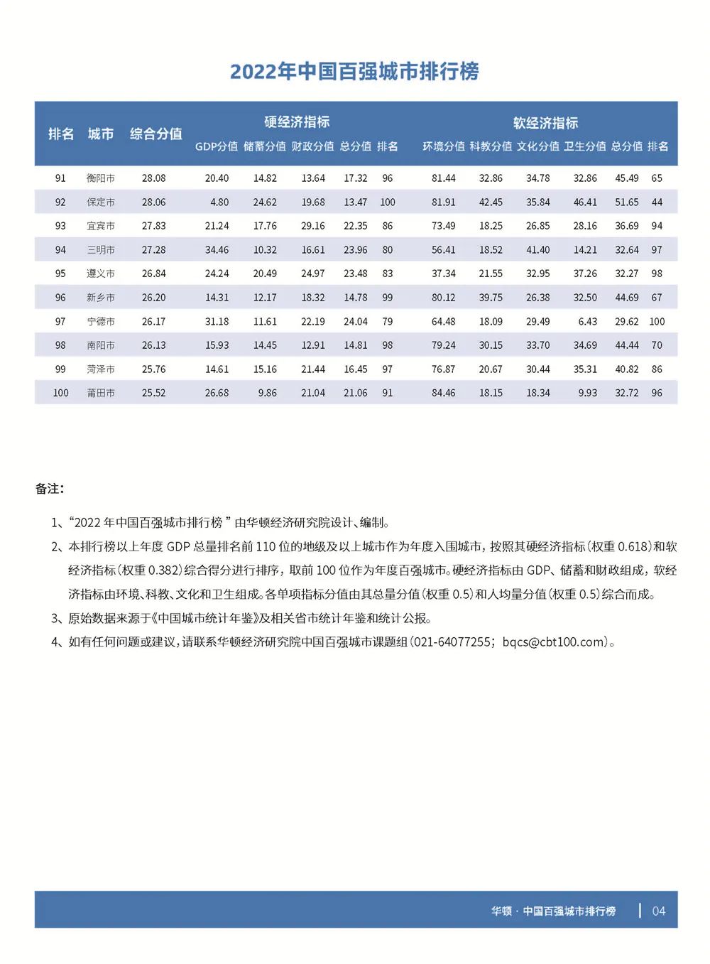 据悉,该榜单以GDP总量排名前110位的地级及以上城市作为年度入围城市,按照其硬经济指标(权重0.618)和软经济指标(权重0.382)综合得分进行排序,取前100位作为年度上榜百强城市。硬经济指标由GDP、储蓄和财政组成,软经济指标由环境、科教、文化和卫生组成。各单项指标分值由其总量分值(权重0.5)和人均量分值(权重0.5)综合而成。