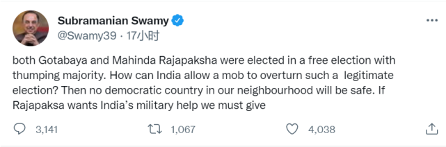 值得一提的是,就在上述推文发布前不久,印度人民党高级领导人、前内阁部长斯瓦米(Subramanian Swamy)发布推文称:“戈塔巴雅(即斯里兰卡总统拉贾帕克萨)和(前总理)马欣达·拉贾帕克萨都是在自由选举中以压倒性多数当选的,印度怎么能够放任暴徒推翻如此合法的选举?那么,我们附近的任何民主国家都不会安全。如果拉贾帕克萨想要印度提供军事帮助,我们必须给予。”