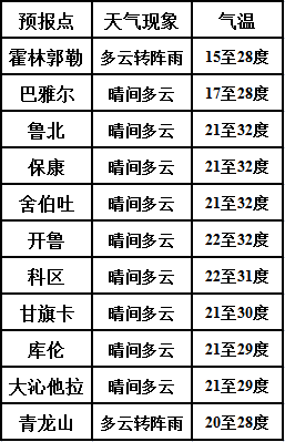 今天夜间到明天白天:霍林郭勒、奈曼旗南部有阵雨或雷阵雨,其余地区晴间多云,南风3-4级 ;市区最低气温:22℃,最高气温:31℃。