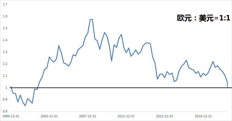 从去年中开始欧元兑美元一直走弱,一年多时间里,从1.23跌到目前二者平价水平。